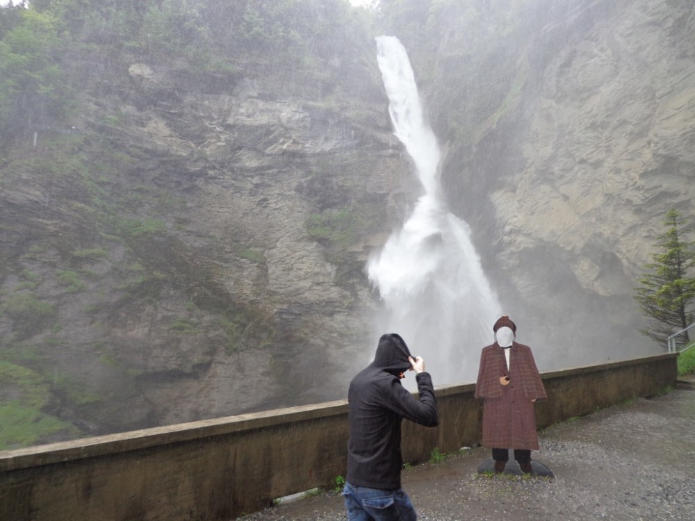 While we could stay onboard the train to continue our trip to Lucerne, we decided to get off in the ‘Sherlock Holmes‘ town of Meiringen to visit the famous Reichenbach Falls. One of the first things we encountered was a statue of the famous English detective Sherlock Holmes, who happened to die here when falling into the Reichenbach Falls. Of course the tourist agency of the town makes good use of the story to attract the tourists.