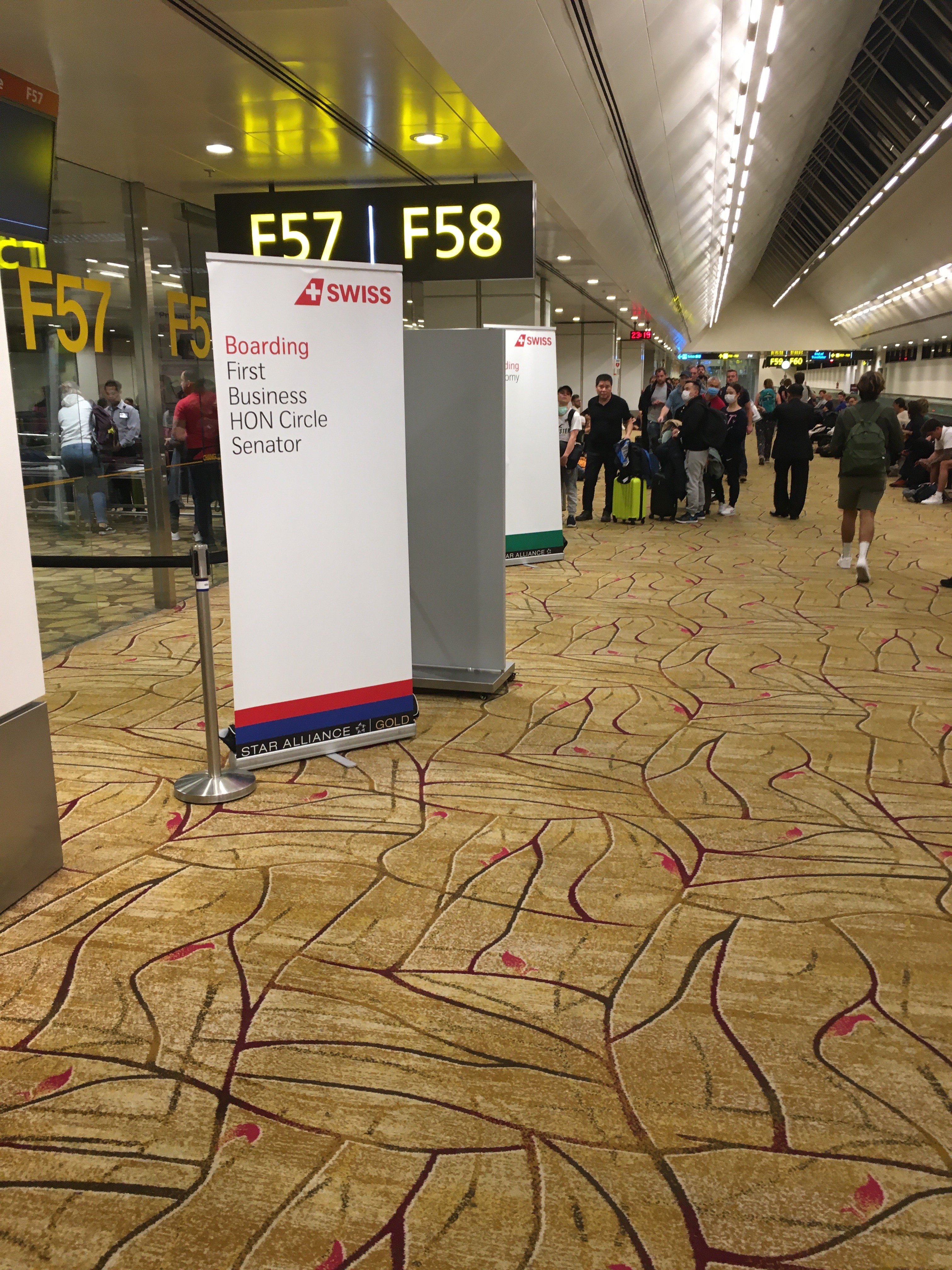 After our brief stop in the Singapore Airlines SilverKris Lounge we made our way to the other end of Terminal 2 where our Swiss Boeing 777-300ER to Zurich was parked. In Singapore you have to go to your gate on time as the security check is performed at each gate individually. After passing security we had to wait a bit in a holding room before being allowed on the plane.