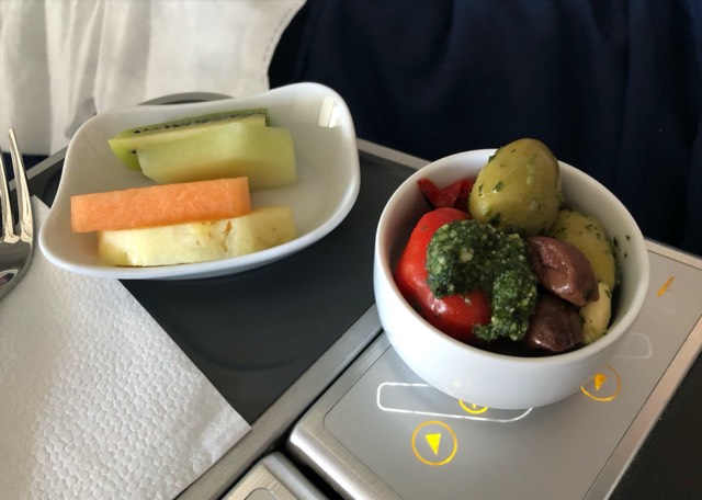 In the middle of the flight, some snacks were served. Both packaged snacks and plated ones.