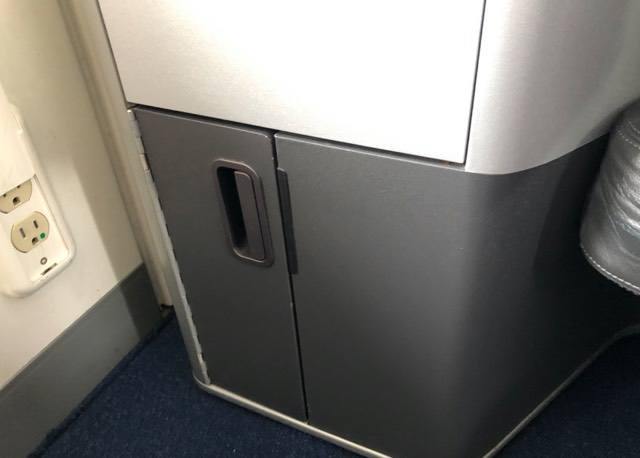 In front of the seat is a small storage compartment, which contained a bottle of water and the amenity kit. I really like the design of the amenity kit, by the way.