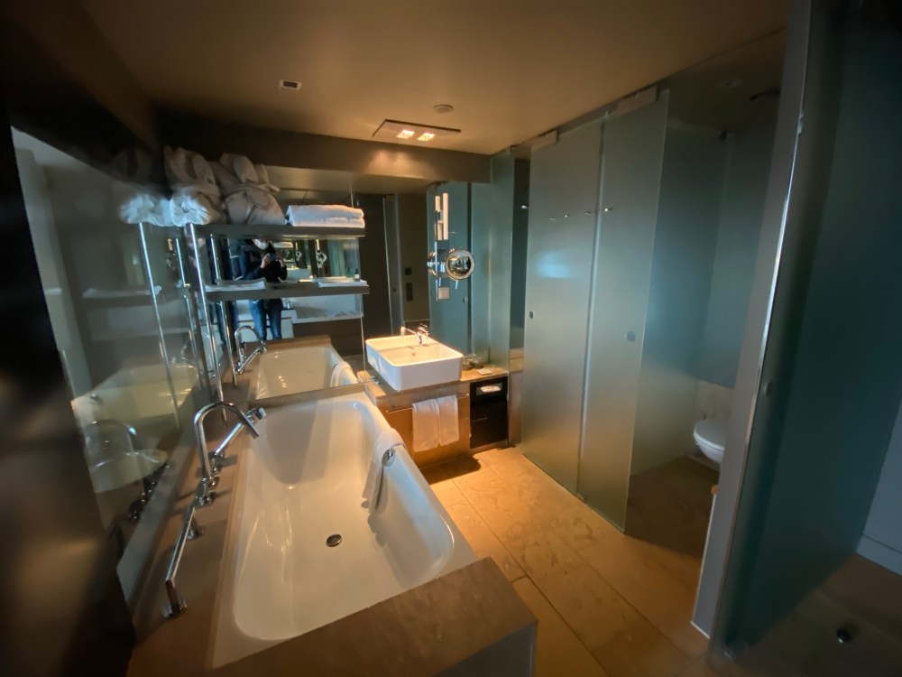 The bathroom was semi open, if you wished you could leave it fully for everything to be on full display, but luckily there was a blind covering the window between the bath and the bedroom. The side could be closed using frosted glass sliding doors, which where unfortunately very noisy to use and did not close off very well. Leaving big gaps.