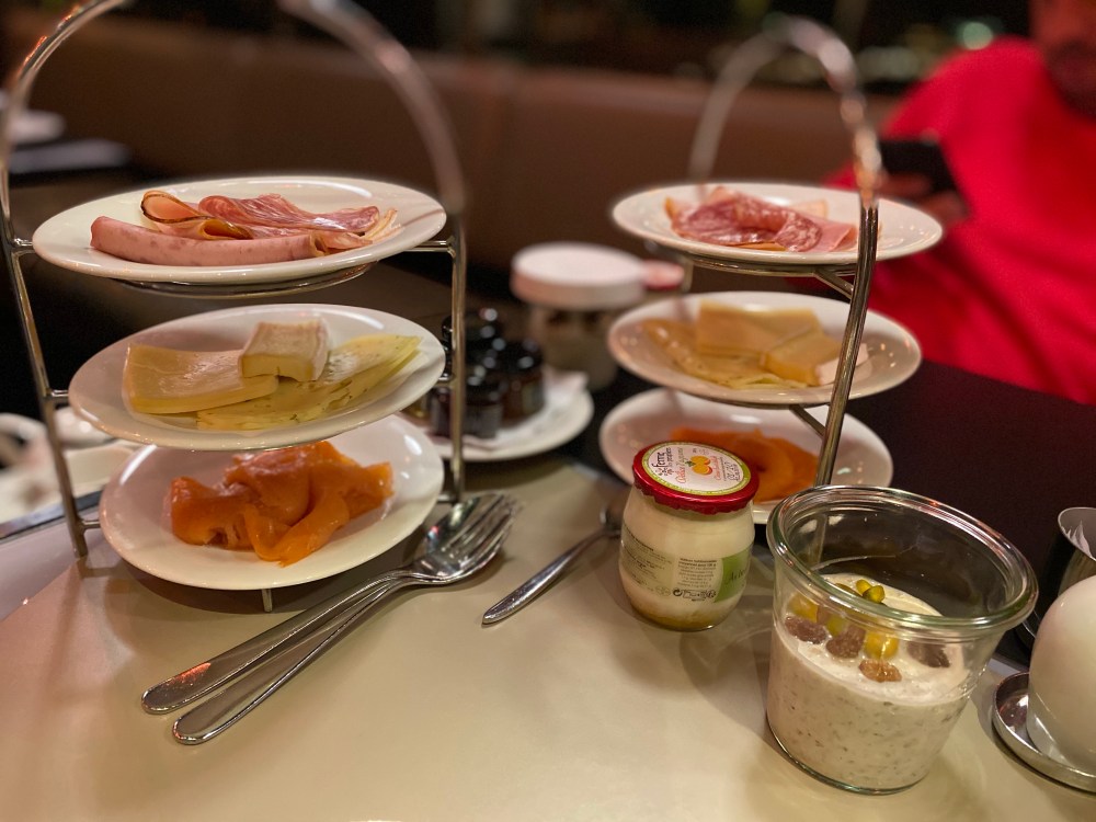 In the morning the normal breakfast area with a buffet was out of service, instead the guests where directed to the hotel restaurant next to the entrance where you could order an a la carte breakfast. The first morning we ordered the full Sofitel breakfast, which was priced a bit steep at €40 , the other mornings we ordered just the continental or vegetarian breakfasts. Of course if you wished you could also order separate plates, but everything was rather expensive so a bundled option still offered better value for money. Everything was presented beautifully on the table using étagères and baskets. They also put smaller extra tables so they could put everything near to you as it was a vast offer. Remarkably the contents of the bread basket differed each day, just as the provision of juices and yoghurt.