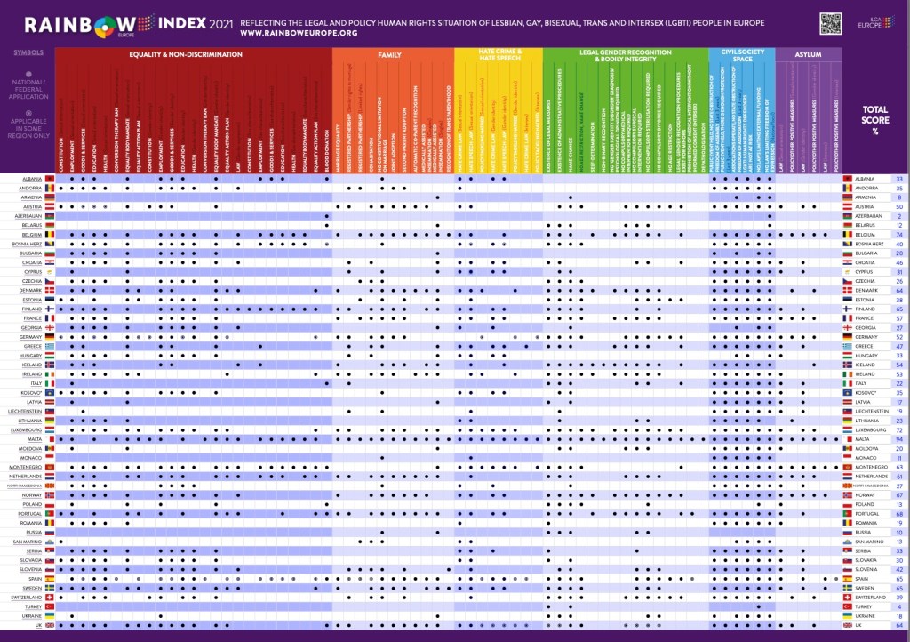 All Rainbow Europe 2021 information is available to access on the updated Rainbow Europe web module at www.rainbow-europe.org. The web module is a free online collection of all the data that lies behind the Rainbow Europe Map, accessible to view on your desktop, tablet or smartphone.