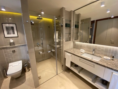 The bathroom was also huge and well appointed, truly what they would call in French a ‘salle de bain‘, only our bathroom in InterContinental Ljubljana was equally impressive. There was a huge bath tub, a big walk-in rain shower and plenty of room to store all your stuff.