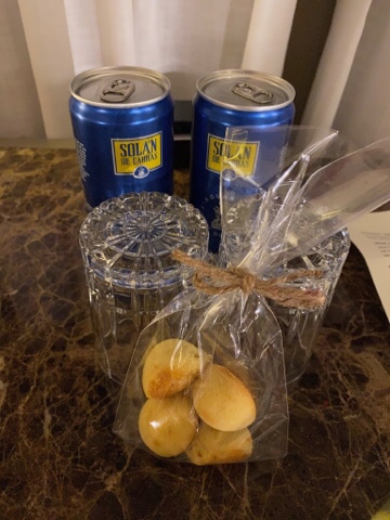 Upon arrival a welcome note and a pack of cookies was waiting on the bed and every night at turndown service we received two cans or bottles of water with another pack of cookies or cakes, a very nice touch.
