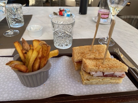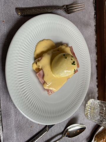 In the morning breakfast was served in the main restaurant on the ground level. You where served a tray with some toast, charcuterie, cheeses, fruit and jams along with a daily changing pastry. Fresh orange juice and coffee or tea where served alongside. There was also a menu from which you could order some hot dishes like eggs benedict.