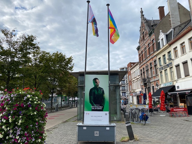 But somehow panel 1 with Gael Leung Chong Wo is hard to find. Not on a visible corner, but on the side, near the parking entrance. So it feels like Antwerp Pride is saying “look at us, but also not”. Panel 2 at De Coninckplein is more visible though.