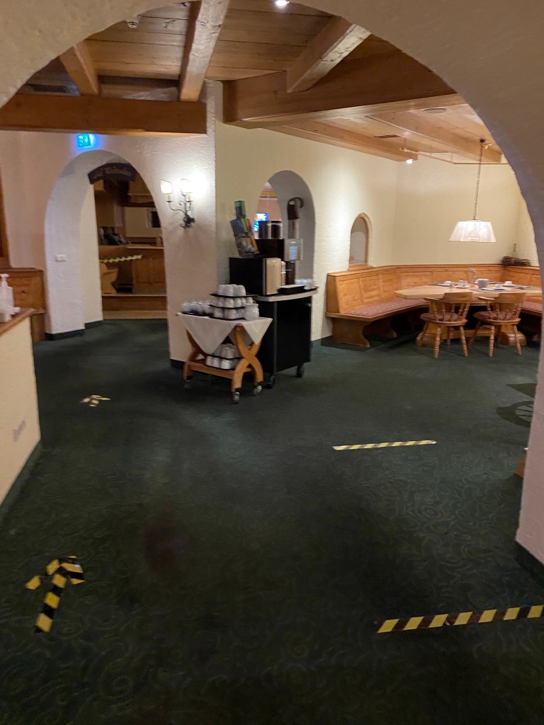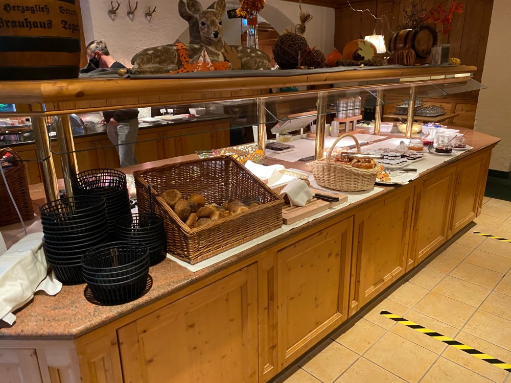 In the morning the breakfast was served in the Alt-Partenkirchen restaurant. It was decorated using a lot of wood, but the lack of natural light made it feel rather dark inside. Except for some one way signage, the assigning of a table and the forced use of throw away plastic gloves there wasn’t really a lot of corona countermeasures put in place.