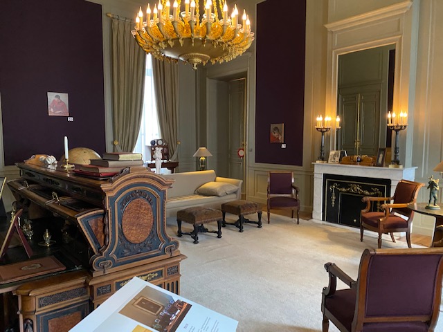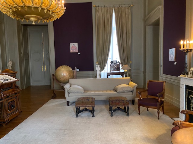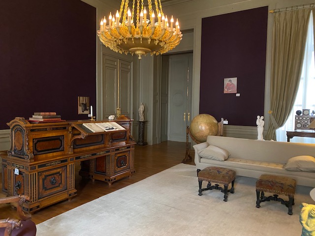 A marble bust of Albert I’s wife Queen Elisabeth stands on the mantelpiece and is by Victor Rousseau. The Louis XVI folding chair came from Louis XVI’s room at the Château de Compiègne. The Klems piano originally belonged to Prince Philippe, Count of Flanders, King Albert I’s parents, and is ebony inlaid with copper, mother-of-pearl, silver, rosewood and tortoiseshell.