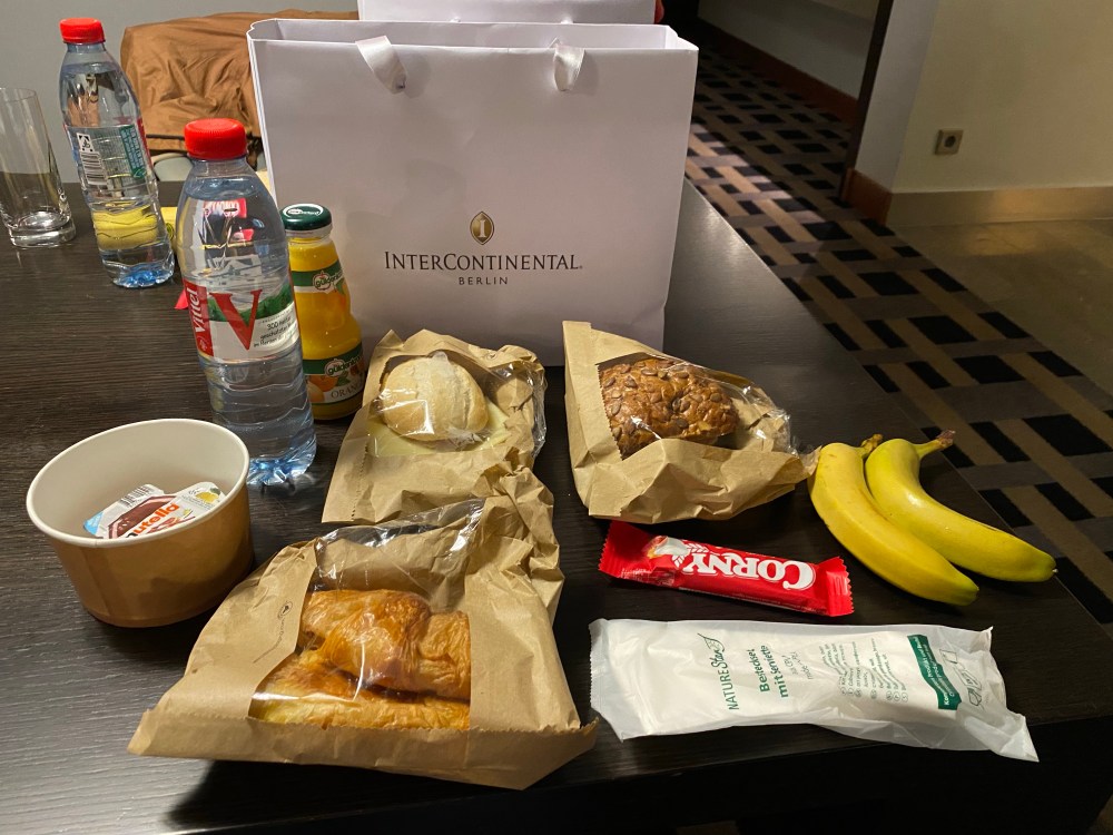 As on the day of our departure we had an early train to catch, the breakfast buffet wasn’t opened yet but the hotel kindly provided us with a breakfast to go, it consisted of some pastries, some breads, granola bars, fruits, a juice and some water.