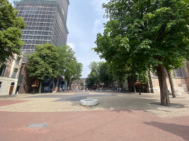 The central nave of the cathedral which collapsed in the storm of 1674 is now a square with large trees, the Domplein. Stones in various colours indicate in the pavement the original outlines of the church.