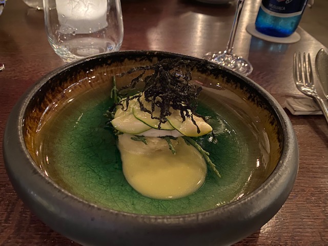 - Scallops with savoy cabbage, lardo and bottarga. Served with a chardonnay.
