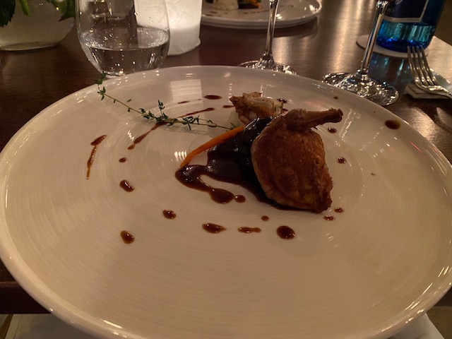 - Quail, barbarie duck, celery and truffle. Served with a corvina veronese.