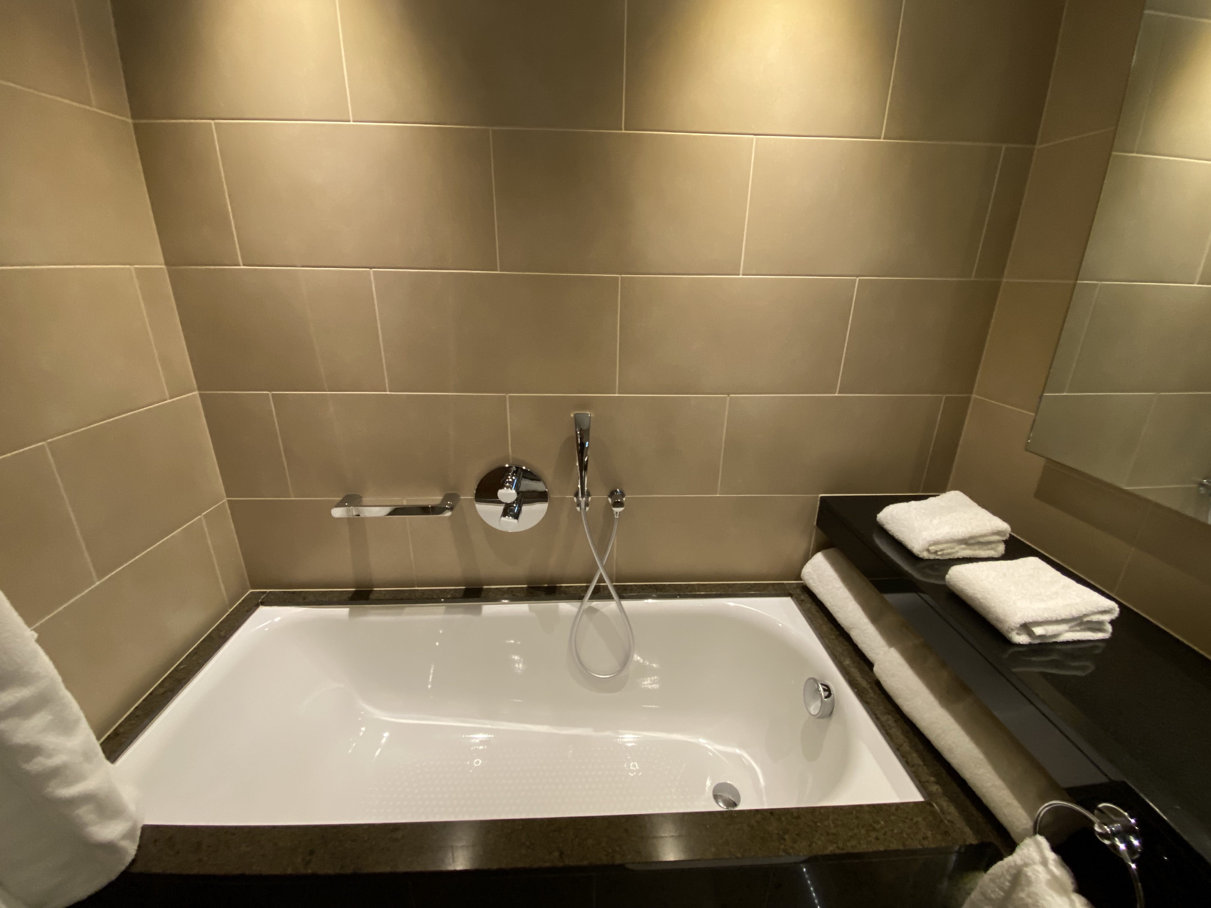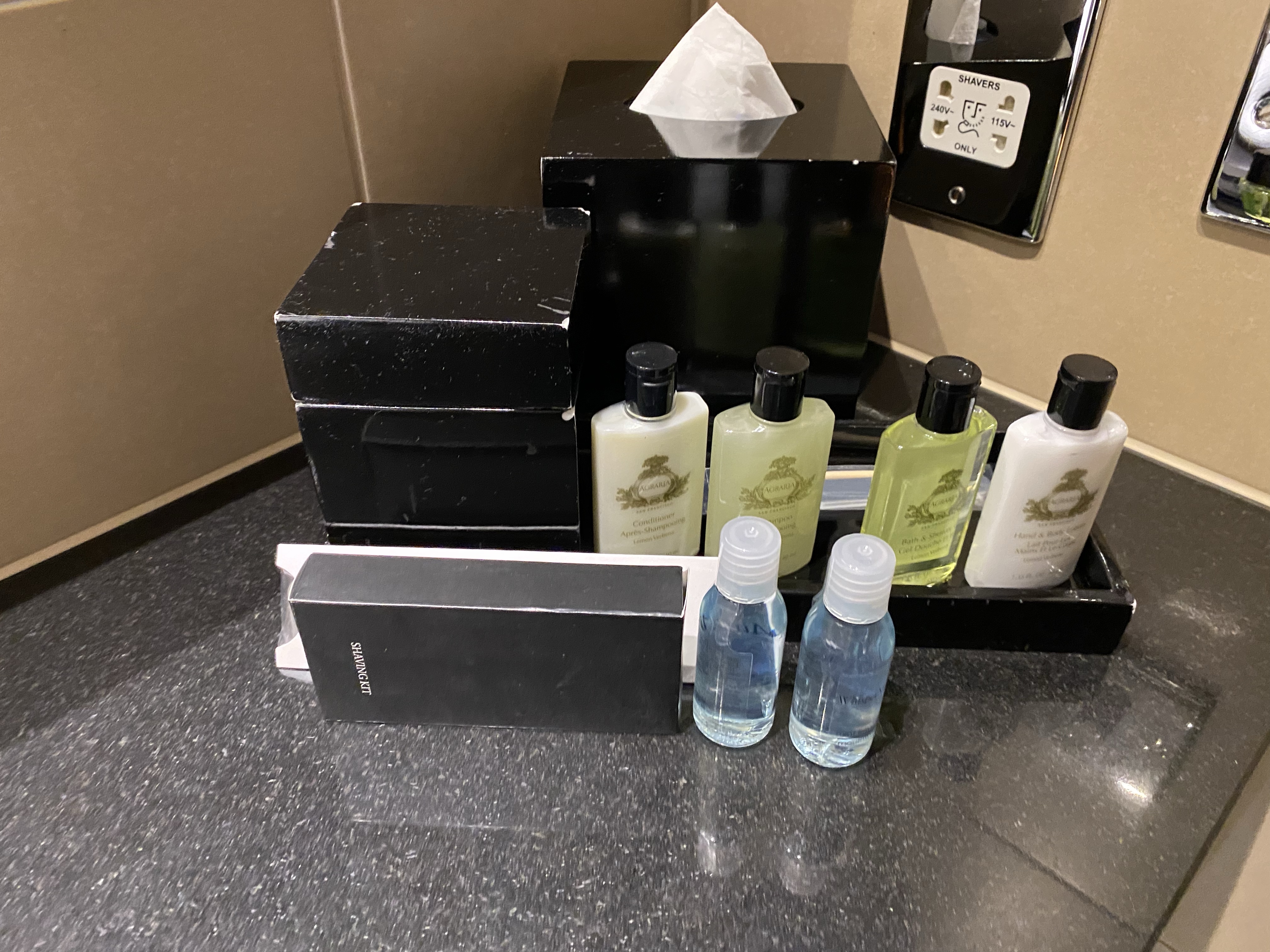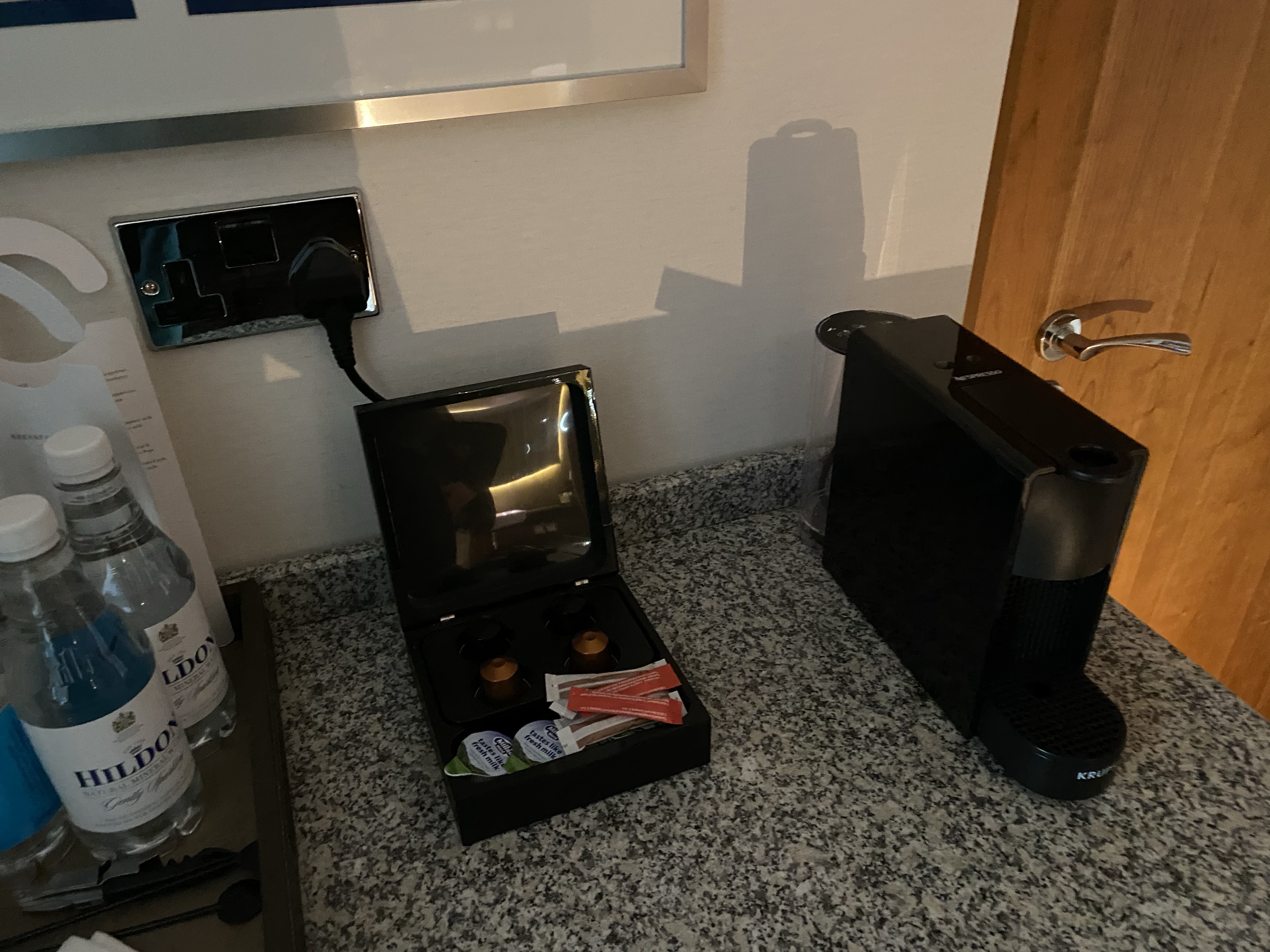 In the entrance there was a big closet with sufficient space to store your stuff. The minibar was fully stocked but locked. They also had a cheap looking coffee pod machine as well as a separate kettle for hot water and tea and hot cocoa. Unlike some other UK hotels they didn’t provided cookies with the tea and coffee facilities. Both a bottle of still and sparkling water where provided complimentary.