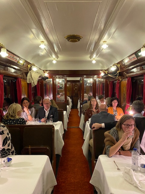 Danny, Sam, Oriol and I booked a dinner in October. As the CIWL coach was fully booked too quickly, we booked a table in the converted 1st class M1. The original Henry Van de Velde interior design was slightly enhanced, as tables were added. The outside livery was also adapted. Instead of NMBS / SNCB green, the Prussian blue of CIWL was used.