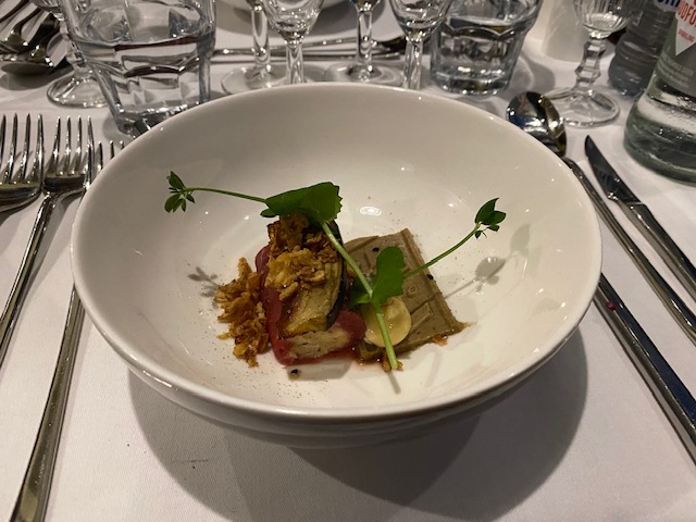 1. Autumnal trio: pheasant mousse, pickled red cabbage, cranberry; rilette of smoked trout, celeriac and jonagold; foie gras, nut crunch and sweet brioche.