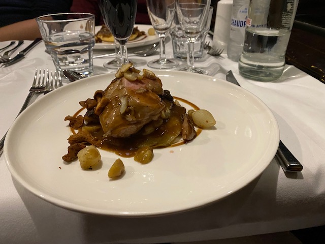 4. Main: veal fillet pure; forest mushroom tarte Tatin; mash of green cabbage and morels; truffle gravy. Second serving: veal ragout with truffle.