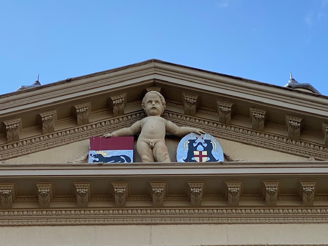- Dordrecht Town Hall was built between 1383 and 1388 by Flemish merchants. They used the building as a market hall. From 1544, it housed the city’s administration and found its current use as Stadhuis (city hall). The cellars with cross vaults date from the 17th century. At that time, the city prison was part of the Town Hall. In the attic, the original wooden structures of the roof can still be seen, as well as the old prison cells. Between 1835 and 1845, the building was radically rebuilt. The façades lost their medieval appearance; city architect G.N. Itz gave the building a neo-classical façade with a central, raised and slightly protruding portico of columns with a pediment. The belfry is remarkable; it is very similar to the tower of Nieuwkerk 44 (also by Itz) and was intended to convey the power of the administrators. Later, two cast-iron lions were placed on either side of the monumental staircase.