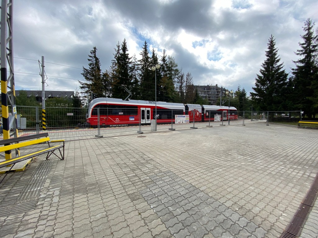 After ascending the hairpins on the road towards Štrbské Pleso, we arrived there more or less on time. We exited the bus and headed for the station as we saw a GTW2/6 electric unit of the Tatra electric railway standing at the platform. The train was dark and closed however, no staff around. Behind a fence we could also see one of the new rack railway units, which obviously weren’t in use yet.