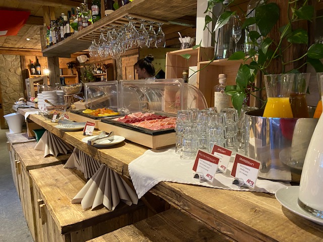 Breakfast is served in La Stalla. The offering is quite substantial for a three-star restaurant. Cheeses, cold cuts, salmon, some salad options, cereals, yoghurts, fruit, honey, coffee, tea and hot chocolate milk, cold milk, juices, croissants, bread rolls, donuts, marble cake.