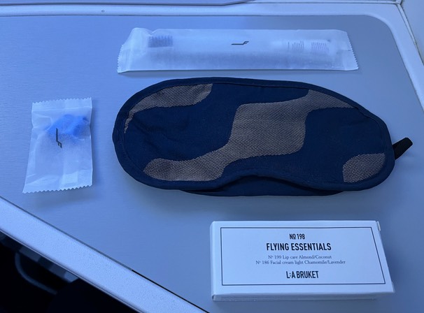 The amenity kit contained a toothbrush, earplugs, eye shades, lip care and facial cream (both by L.A. Bruket). That’s rather basic as far as business class amenity kits go, as other airlines also offer things like combs, penns, perfume or deodorant, mouthwash or socks for example.