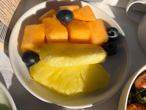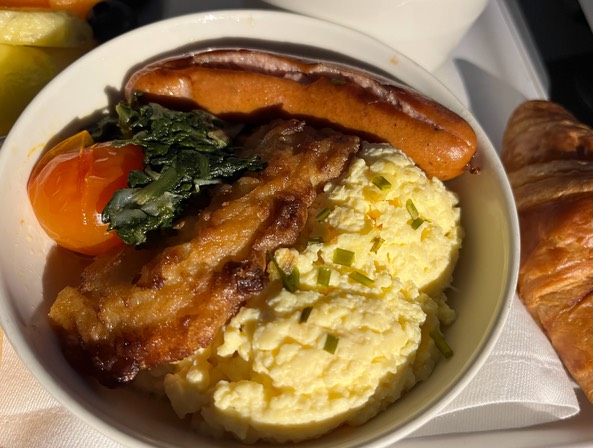 About 90 minutes before landing, the lights were turned on and breakfast was served. Interestingly, this time around the lids were kept on the dishes. That wasn’t the case during dinner. Did the crew just forget to take them off or is this standard procedure?