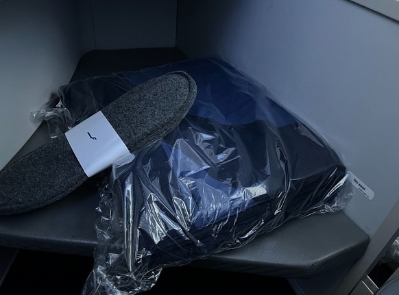 Waiting on our seats during boarding, we found a comfortable pair of slippers, a plush blanket and a pillow.