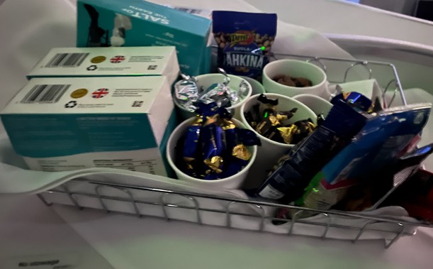 The coffee wasn’t served on a coffee plate, no spoon, no milk, no sugar, nothing. Most airlines also offer something like a chocolate with coffee, but that didn’t happen here. Later, when I went to the toilet, I noticed there was a little snack basket in front of the cabin, though the crew never passed pro-actively with this basket through the cabin.