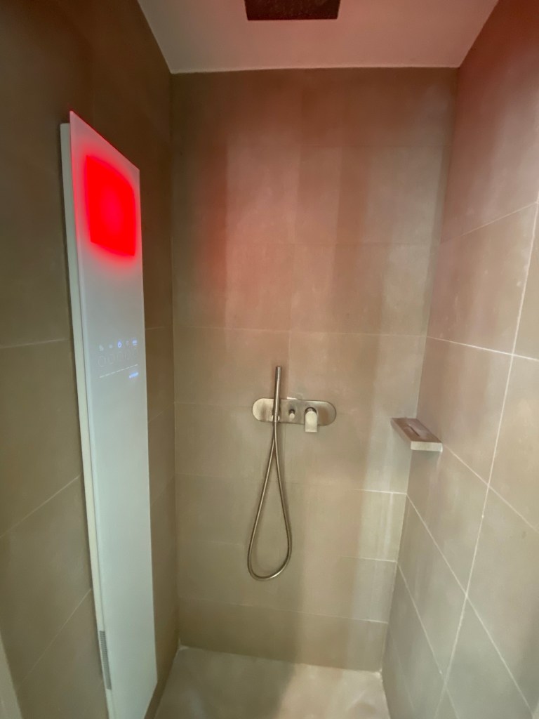 The bathroom also featured a small sauna and a rain shower with hammam functions, both in separate alcoves.