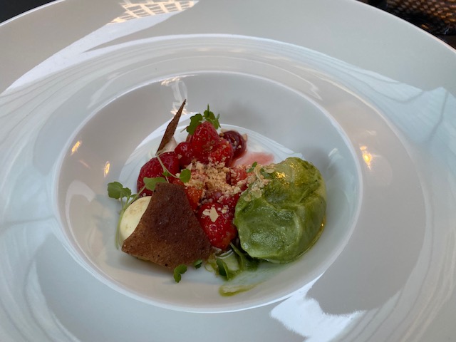 As dessert marinated strawberries with chocolate parfait, aged balsamic vinegar and sorrel sorbet.