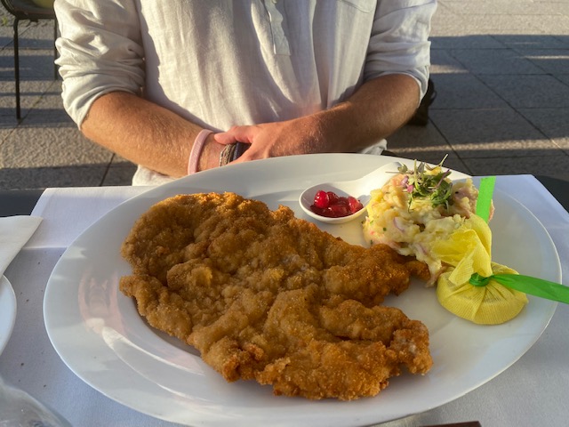 As a main, Steve had the Wiener schnitzel, which was as large as an aircraft carrier deck; while I had fried veal liver with confit bacon onions, glazed mini carrots and potato gratin. That was delicious.