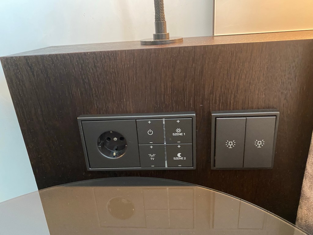 In between the room and the bathroom there was a window which could be covered using a sliding wall. There was a very big walk-in shower with both a fixed rain shower head as well as a handheld head. Which both could be used at the same time.