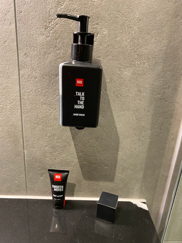 The hotel provided toiletries in multi-use containers featuring some funny quotes, completely on brand for Red.