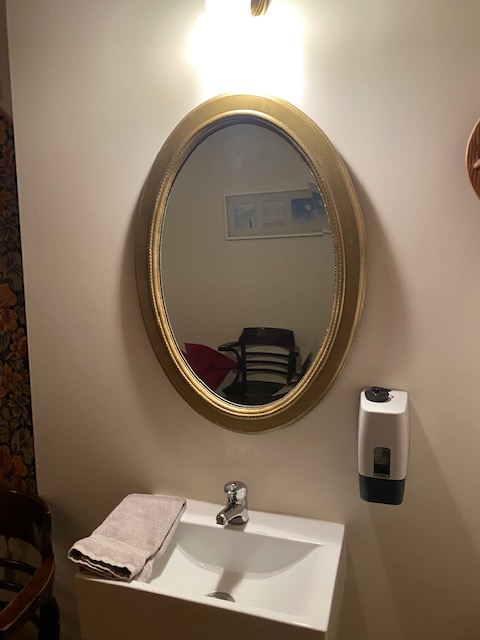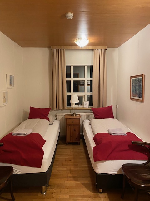 The room proper is small and made me think of a cabin on a ferry. Or in a boarding school. Two beds, a sink. A few pieces of furniture. Not much space. Only one or two power outlets. Basic but cosy and cosy but basic.