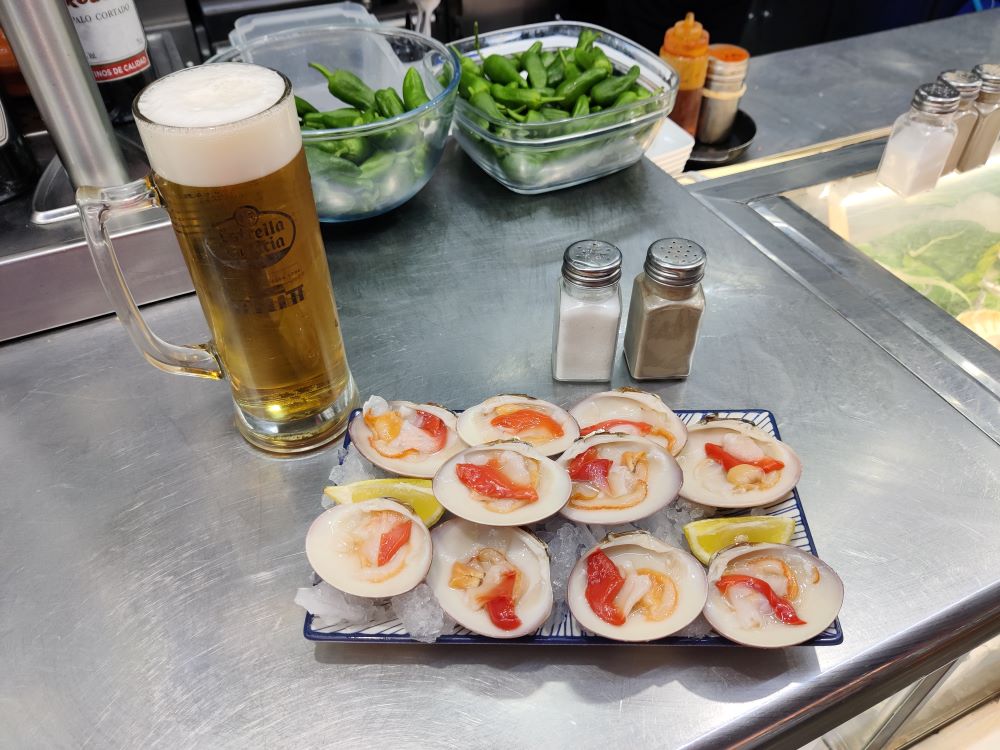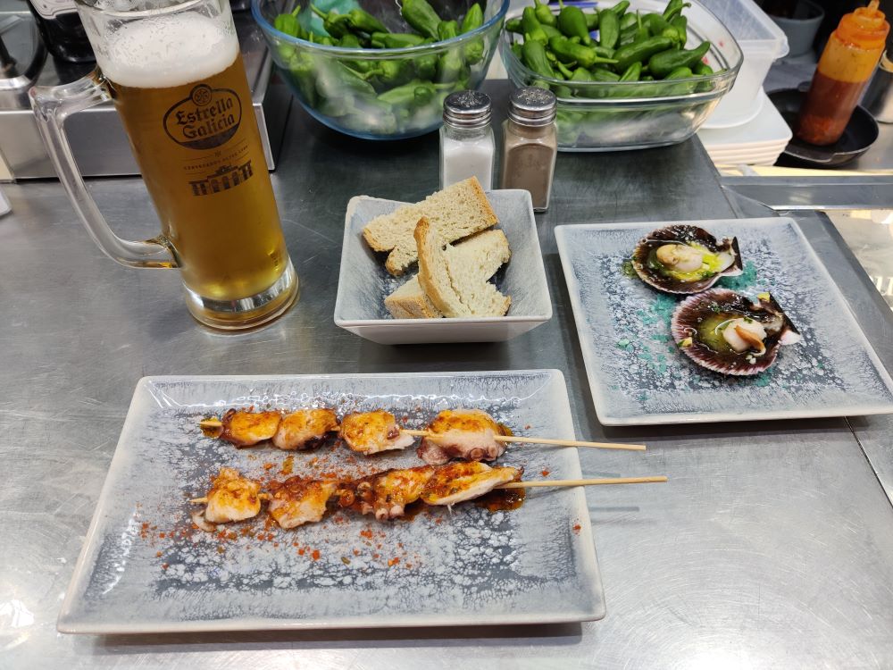 First I had boquerones fritos, fried anchovies. Then I had concha fine Málaga, reddish molluscs that create a burst of salty freshness on your palate. As I couldn’t get enough I also ordered gambas pil-pil, Spanish garlic and chilli prawns. To top it off I had some zamburiñas, variegated scallops prepared with garlic and olive oil.