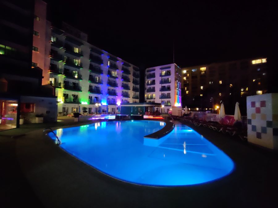 Breakfast and diner are served in a restaurant with hot pink walls and overlooking the swimming pool. I went to the hotel in low season. For diner I could choose a starter, a main dish and a dessert. Drinks were extra charge, but prices were very low.