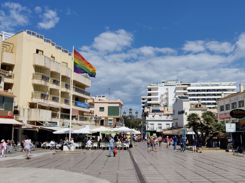 The airport is just 5 km north of Torremolinos. There is a train station at the airport. There you take train C1 in the direction of Fuengirola, a ride of just four stops and eleven minutes and you reach train station Torremolinos. The first thing you see when you leave the station is a big rainbow flag waving at the Plaza de la Nogalera. Your immediately feel welcome.