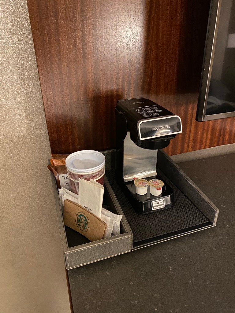 There was also a nice chaise-longue near the window. In the room was also a Keurig coffeemaker, which you also has to use to produce hot water for the tea. In the wardrobe only one bathrobe and a single pair of slippers was available, which is a bit lacking in a two person’s bedroom in my opinion.