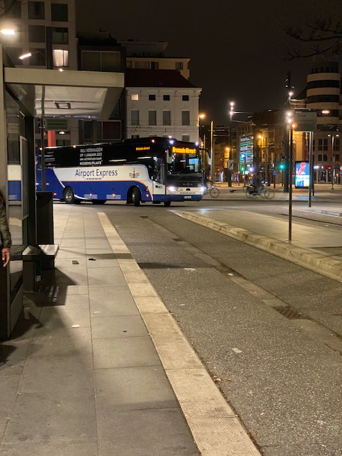 I showed up at the Franklin Rooseveltplaats, platform B5, around 2.45 AM where the Airport Express leaves. There was no bus, but one obvious other passenger. I expected the bus to be there already, but no.