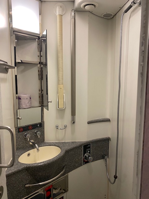 Showering on a train can be a hassle. The warm water is lukewarm at best, but obviously you’re only supposed to shower quickly. Water pressure is okay. Water is timed. Not literally. You push a button and you get some seconds of water. Then you push again and again and again.