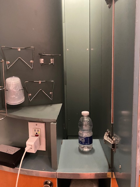 I had the pleasure to have a cabin for two for myself. It features three seats which is converted into a bed for the night. There is an ensuite bathroom which is toilet, sink and shower in one. It’s more practical than it sounds. There are a few cupboards, including a somewhat hidden one. A coat hanger for your coat, a little table which is large enough for my laptop.
