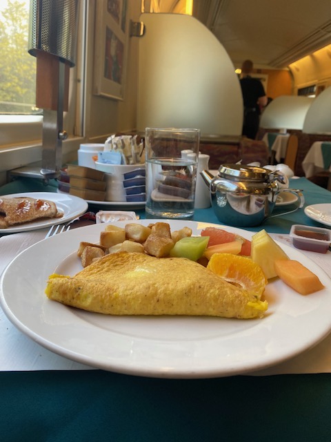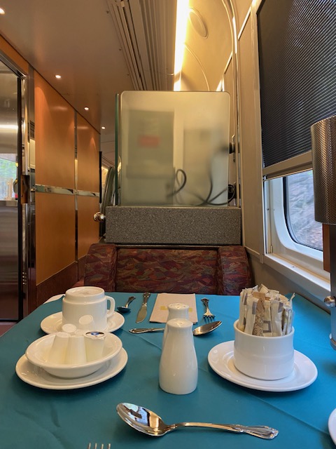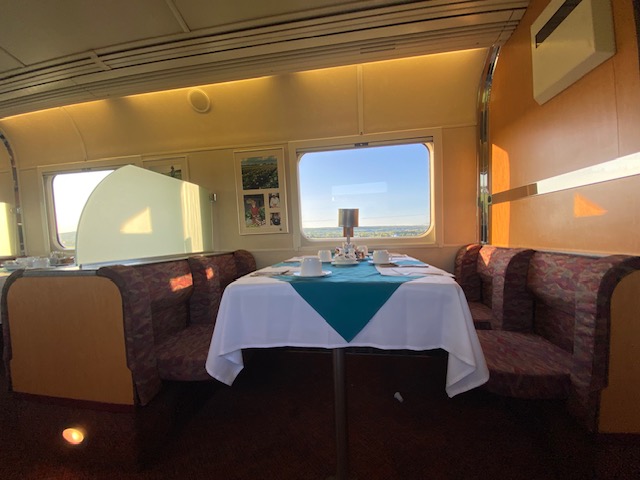 Sleeper passenger eat in the custom-fitted dining car. The Nightstar wasn’t supposed to feature one, only the lounge cars / café cars. Both lunch and dinner are served in two seatings. Breakfast is without reservation.