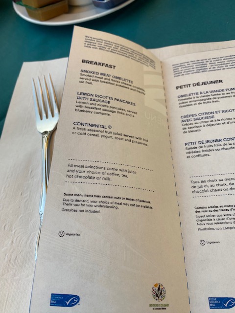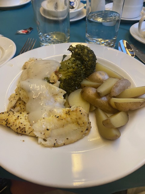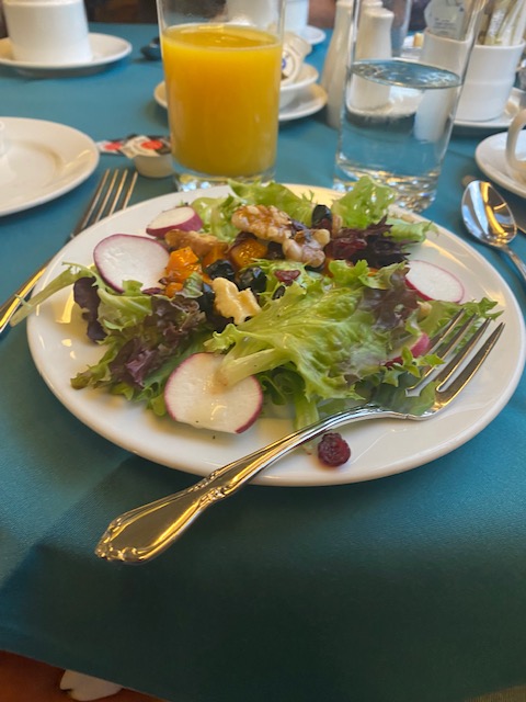 Lunch and dinner have the same pattern. A starter (soup or salad), three main course options and a dessert. Water, soft drinks and tea and coffee are included, alcohol isn’t. There is always or two vegetarian options.