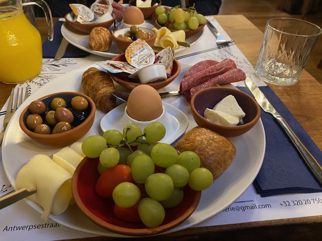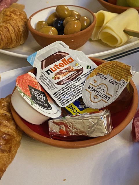 Breakfast is served in the breakfast room. N buffet, but you get a large plate with a Mediterranean twist. The owners of Guzy are of Turkish descent. So the plate contained salami, cheese, halloumi, olives, an hard boiled egg, butter, Nutella, La Vache Qui Rit cream cheese, jam, honey, cherry tomatoes and grapes.