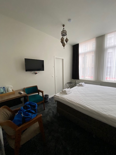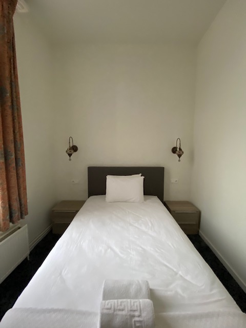 Steve booked a three-person room as it was available and it offered separate beds. Even better, the room consisted of three rooms. A room with a large single bed, a corridor, and a room with a huge kingsize bed which could fit four people having fun. But we didn’t. And of course there’s the bathroom.