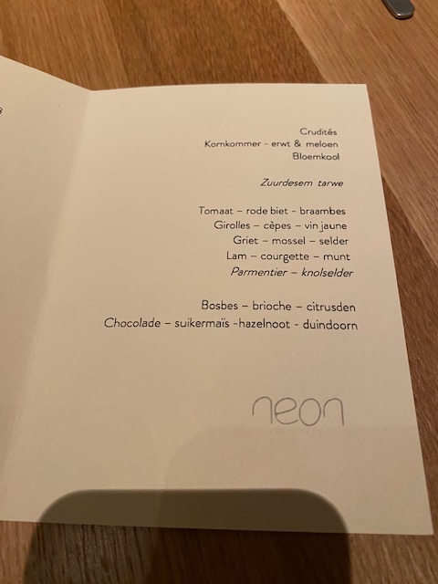 In October 2023, the ‘education crew’ of Frank, Steve, Philippe and Nicolas, and myself (not an educator), dined at Restaurant Neon in Lier. Located in a former school, Neon prides itself of sourcing local ingredients.
