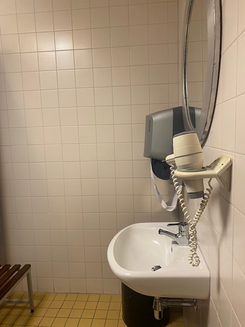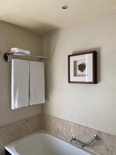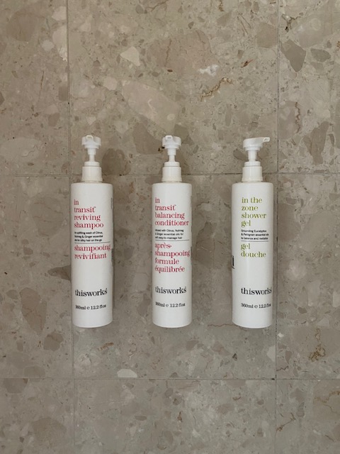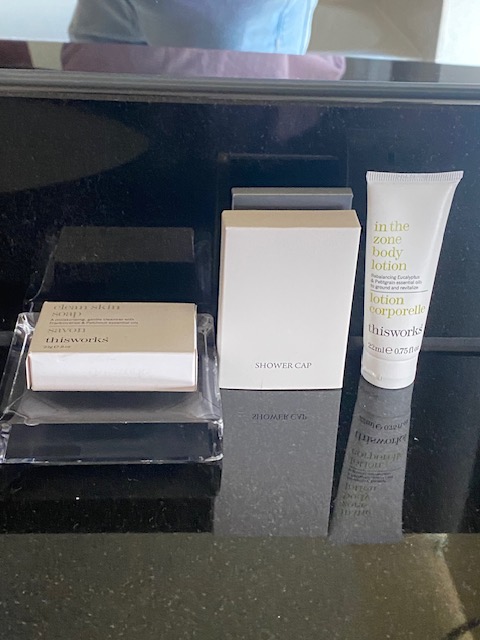 The bathroom is large and features both a bath and a shower cabin. Oddly, there were no soap, shampoo or body wash for the bath. The Thisworks cosmetics were fixed in the shower. The toilet paper display is somewhat impractically attached next to the toilet.
