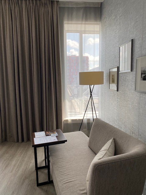 The actual room in a light colour palette features a central bed, a desk and a very good office chair. There is a chaise longue and table. The chaise longue has a neat cushion with the Rotterdam coat of arms. We had windows on two sides so plenty of light. One windowsill had a cushion so you could use that as an extra seat. Nice.