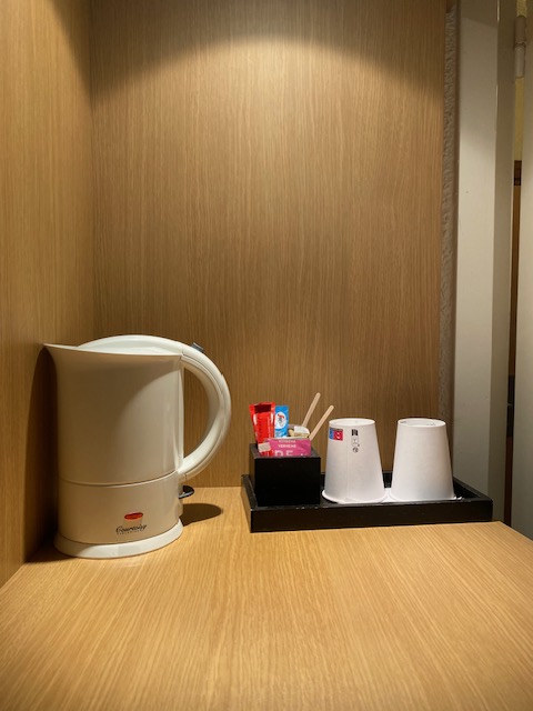 A USB outlet device on the desk. Tea and coffee making facilities. The room is pragmatic. The styling is out of date. “Not so ‘novo‘, this Novotel”, Oriol quipped.