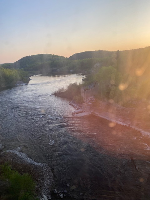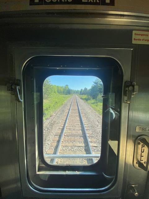 We departed on time and I had a great spot in the dome car. The first leg would bring us to Washago, Parry Sound, Greater Sudbury and Capreol. At Capreol we had a first smokers’ and refueling stop. We accumulated over 5 hours’ delay on day 1, stopping often to let freight trains pass. We also suspect we were sent on the wrong track at the beginning of the journey.
